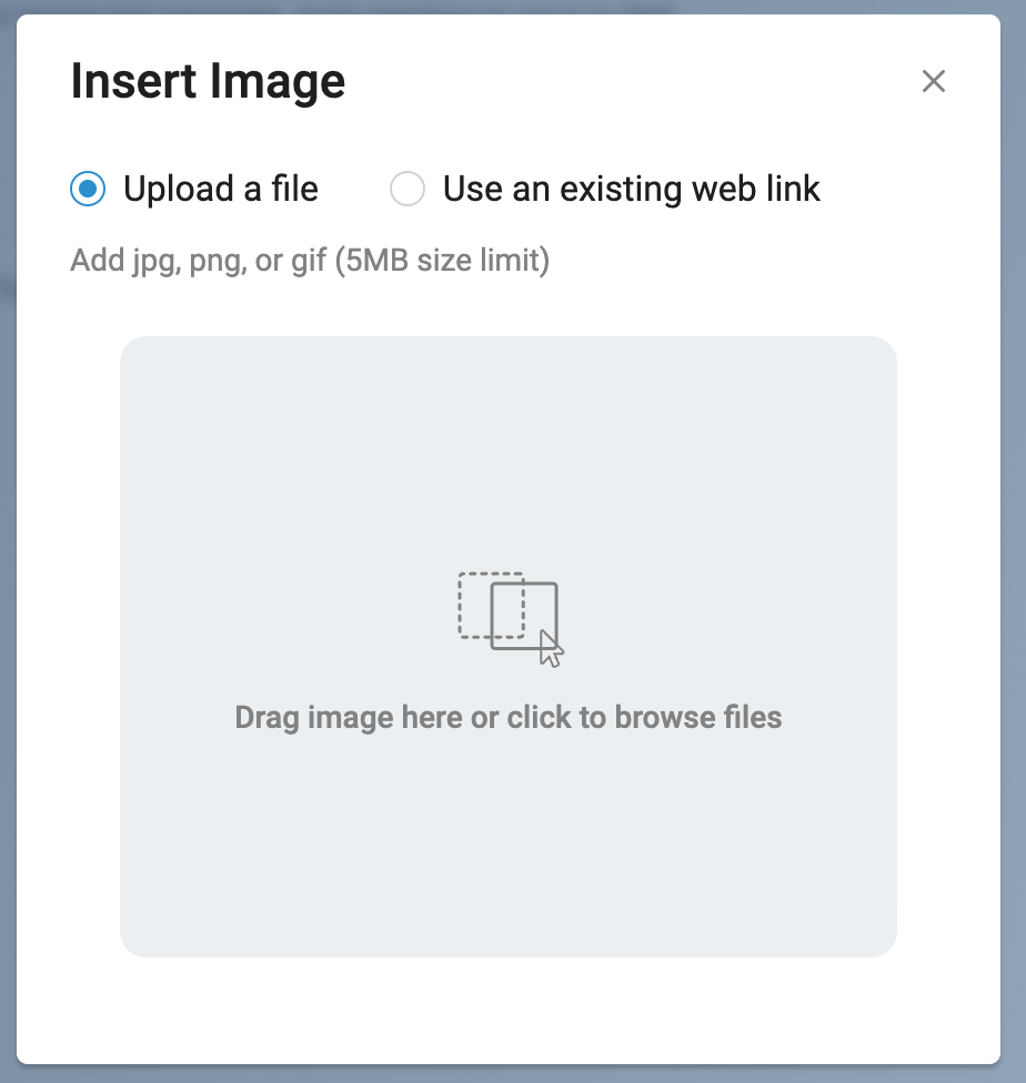 In the Insert Image modal, you may drag and drop an image that you have saved on your hard drive to add it to the message. Alternatively, you may click the Browse button to open your local file storage and select the image file.