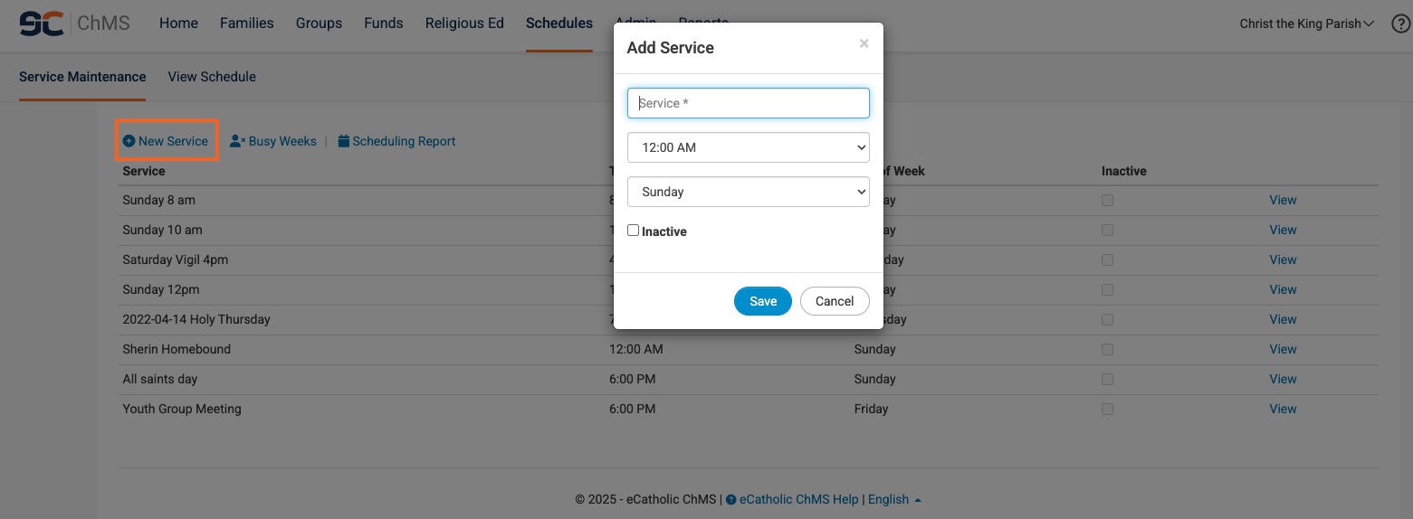 - Inactive - This box indicates whether or not the service is inactive. If this box is checked, the service time will be omitted when generating the schedule. If you have extra seasonal Masses that occur during summer, Christmas, and/or Easter season you can check/uncheck the Inactive box rather than deleting them and needing to create new service times each year.