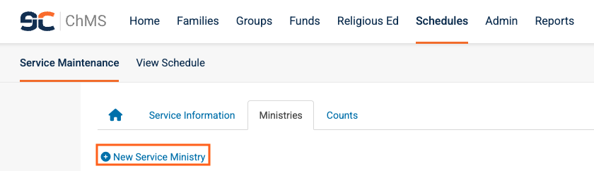 Begin by clicking View next to the Service (see screenshot above). You will automatically be taken to the Ministries tab. Now select New Service Ministry.