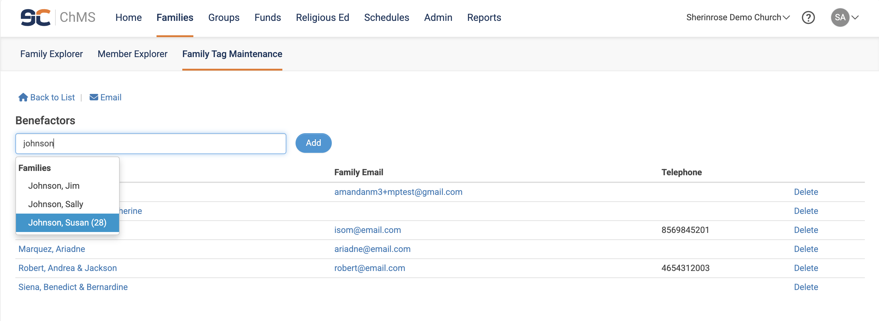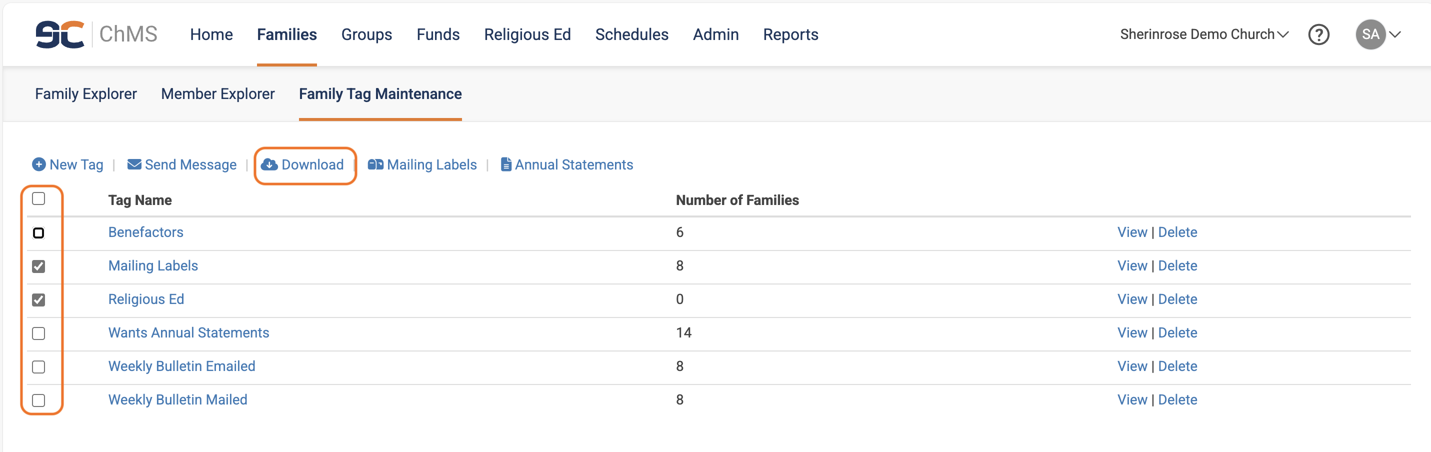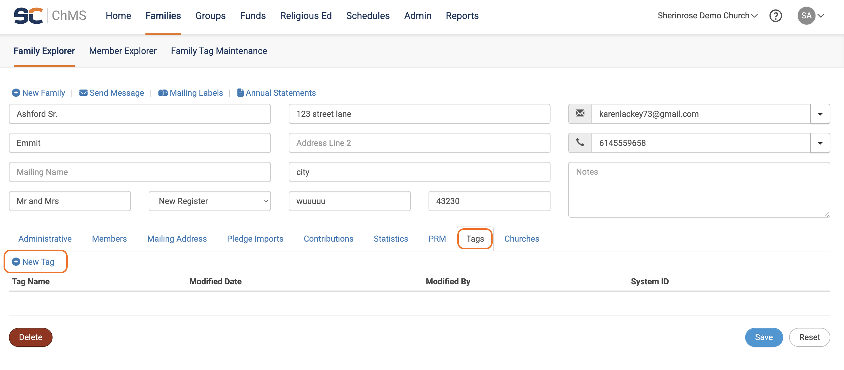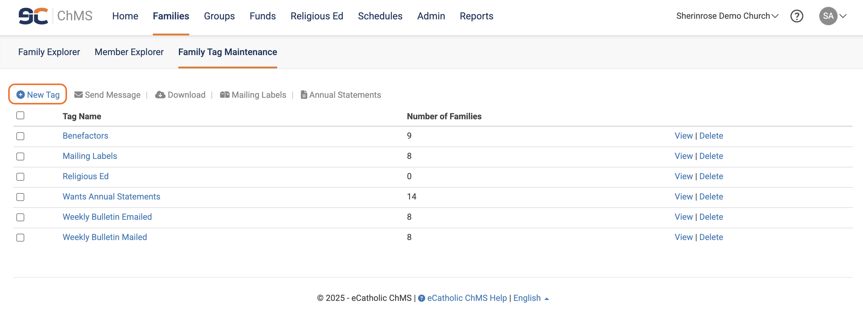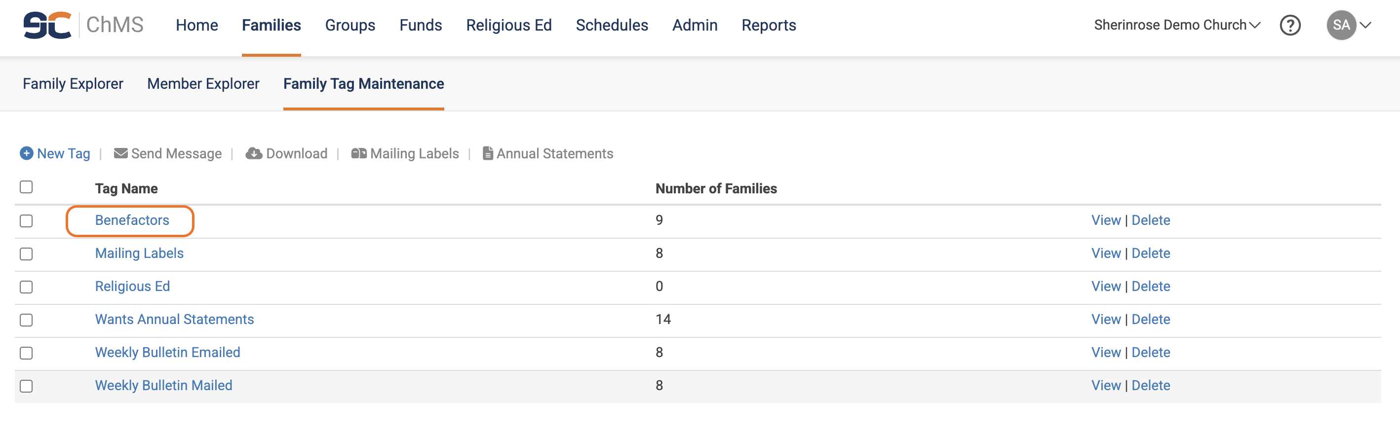 Note: If you click on View while in the Family Record, you can change which tag the family is in. Clicking Delete will delete the family from the Family Tag.