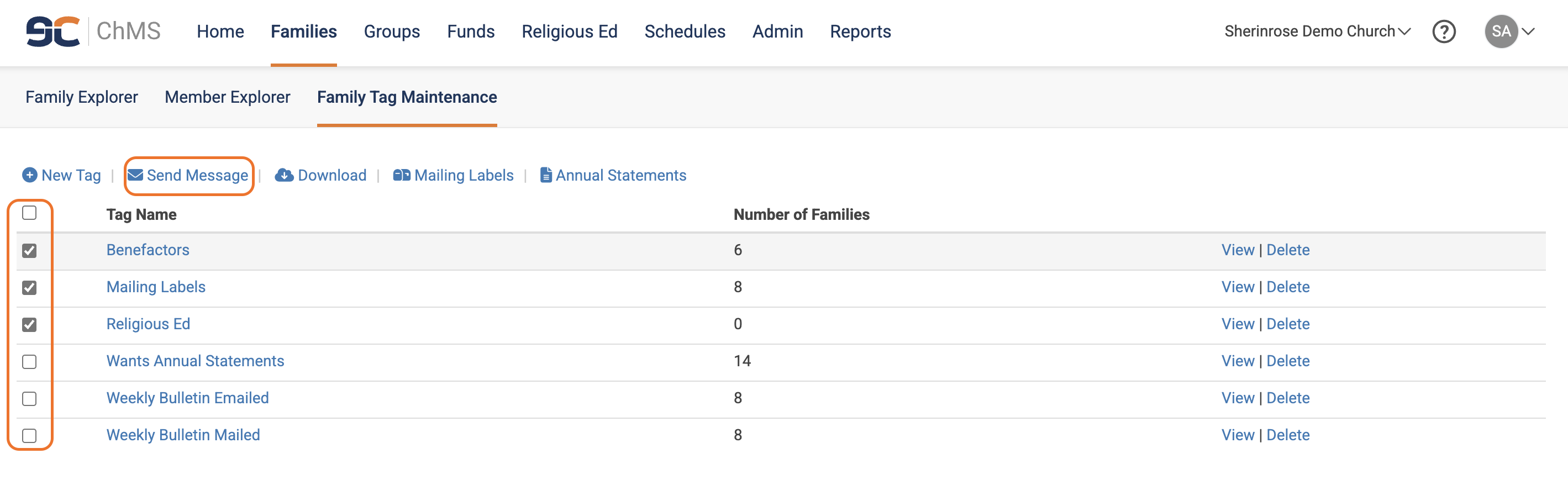 To send a message to all families in your family tags, check the box next to the Tag Name heading.