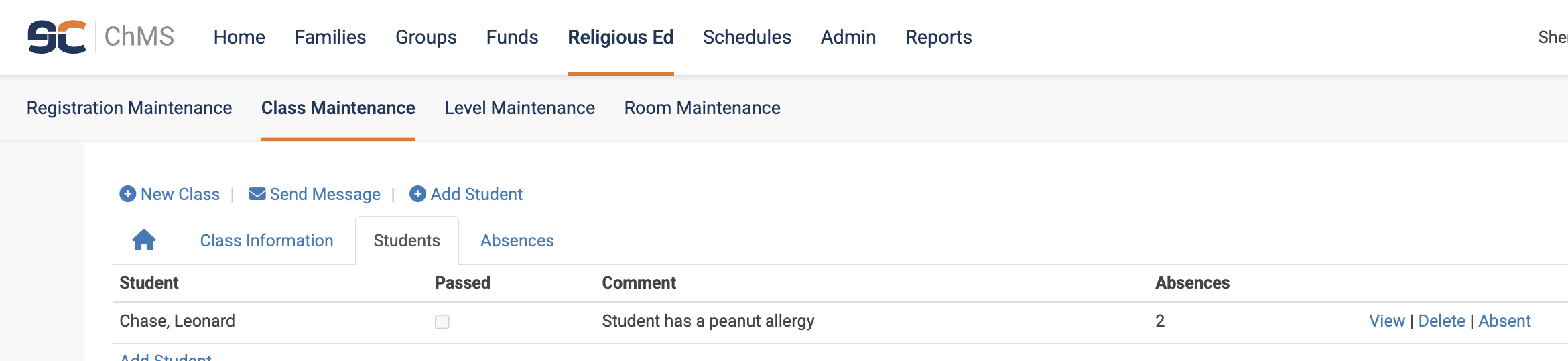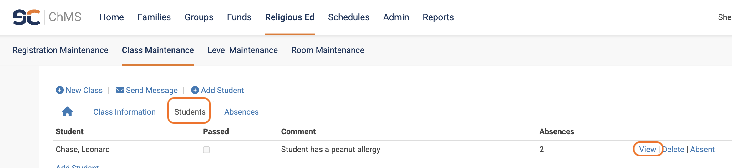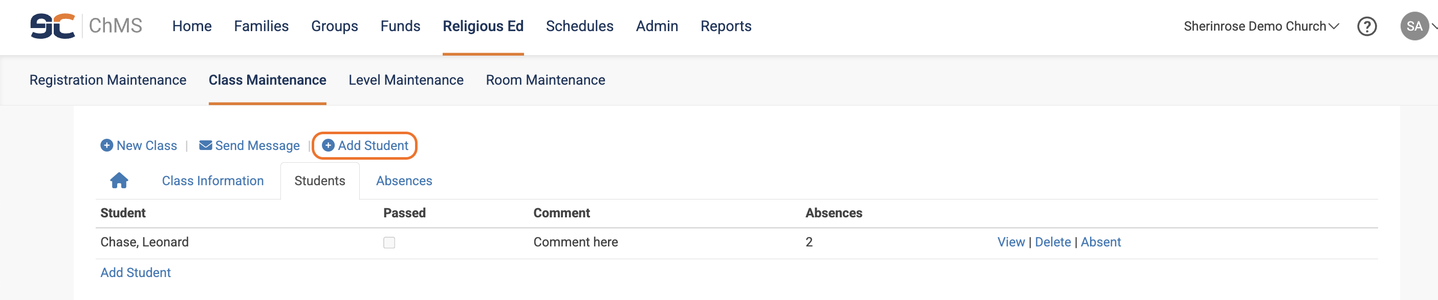 - Scroll to Religious Ed > Class Maintenance select the first class you would like to add students to by clicking on View. Click on the Student Tab and Add Student.