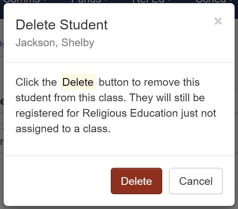 Deleting a student from a class does not remove them from the RE Student Group. Once you delete a student from a class, they will appear in the Class Drop-Down box again so you can add them to another class.