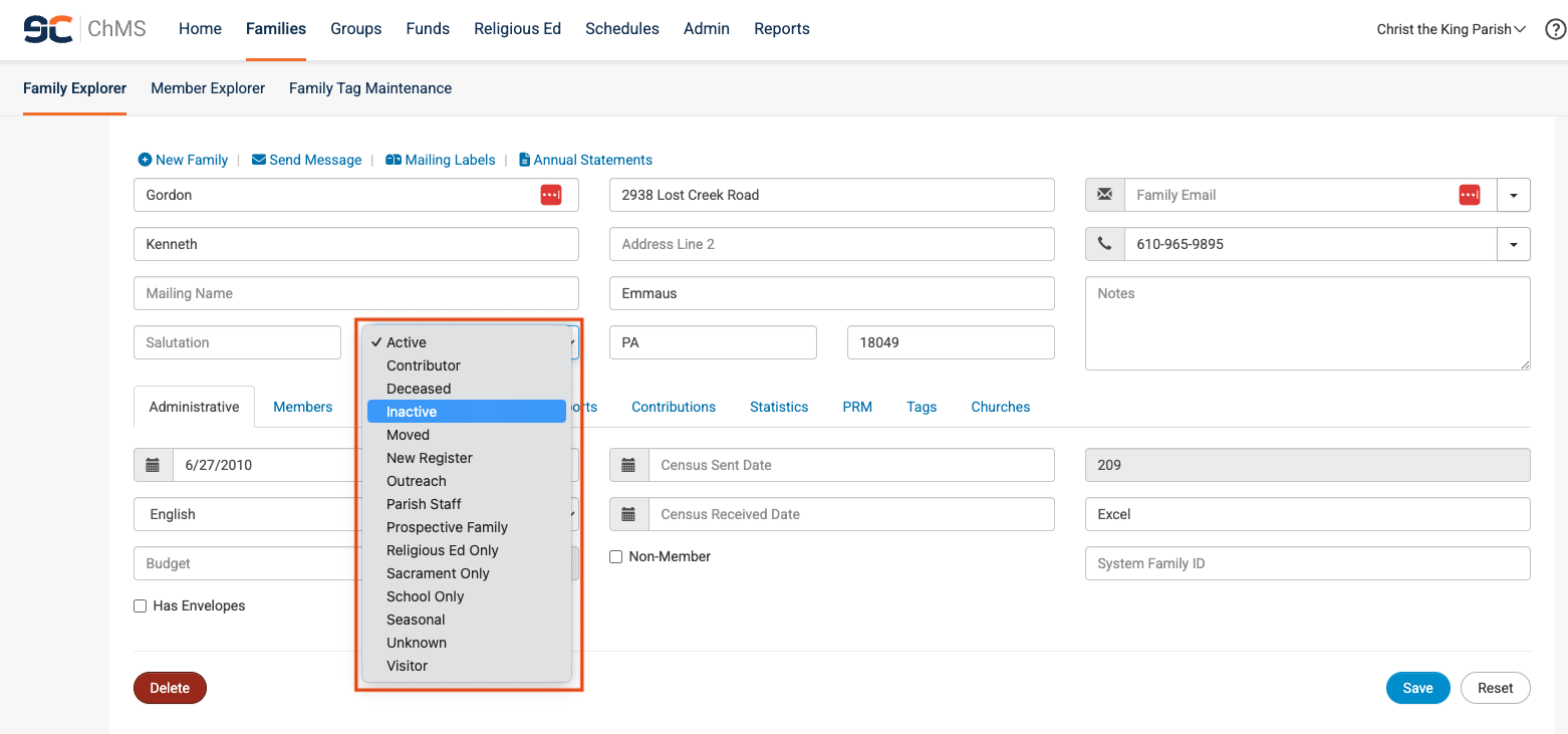 Note: When you mark a family as Inactive, all members of the family will be marked as Inactive, so long as the family is not participating in another parish as part of a Diocesan wide implementation.