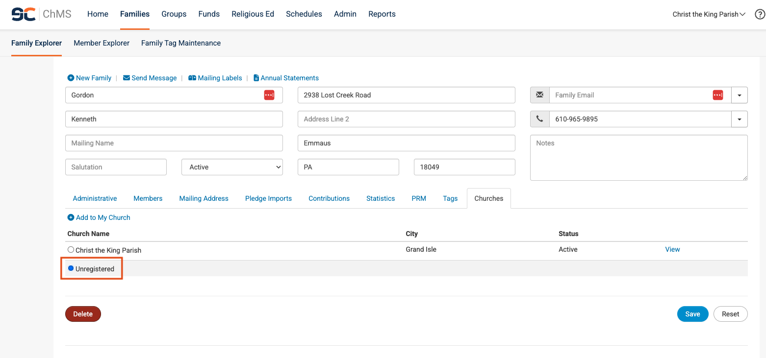 An Unregistered family is one that is no longer in your church or diocese. In general, families with a status of Contributor, Moved, Prospective Family, Religious Ed Only, Sacrament Only, School Only, Seasonal, Unknown, and Visitor may be unregistered.