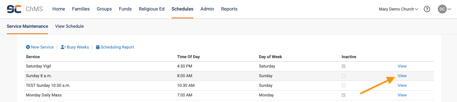 1) Scroll to Schedules > Service Maintenance where you will see a list of your Masses. Click View next to the Mass that you wish to add your Mass Count to.