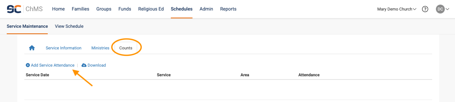 Note: You will need to create "Services" in order to track attendance/Mass counts.