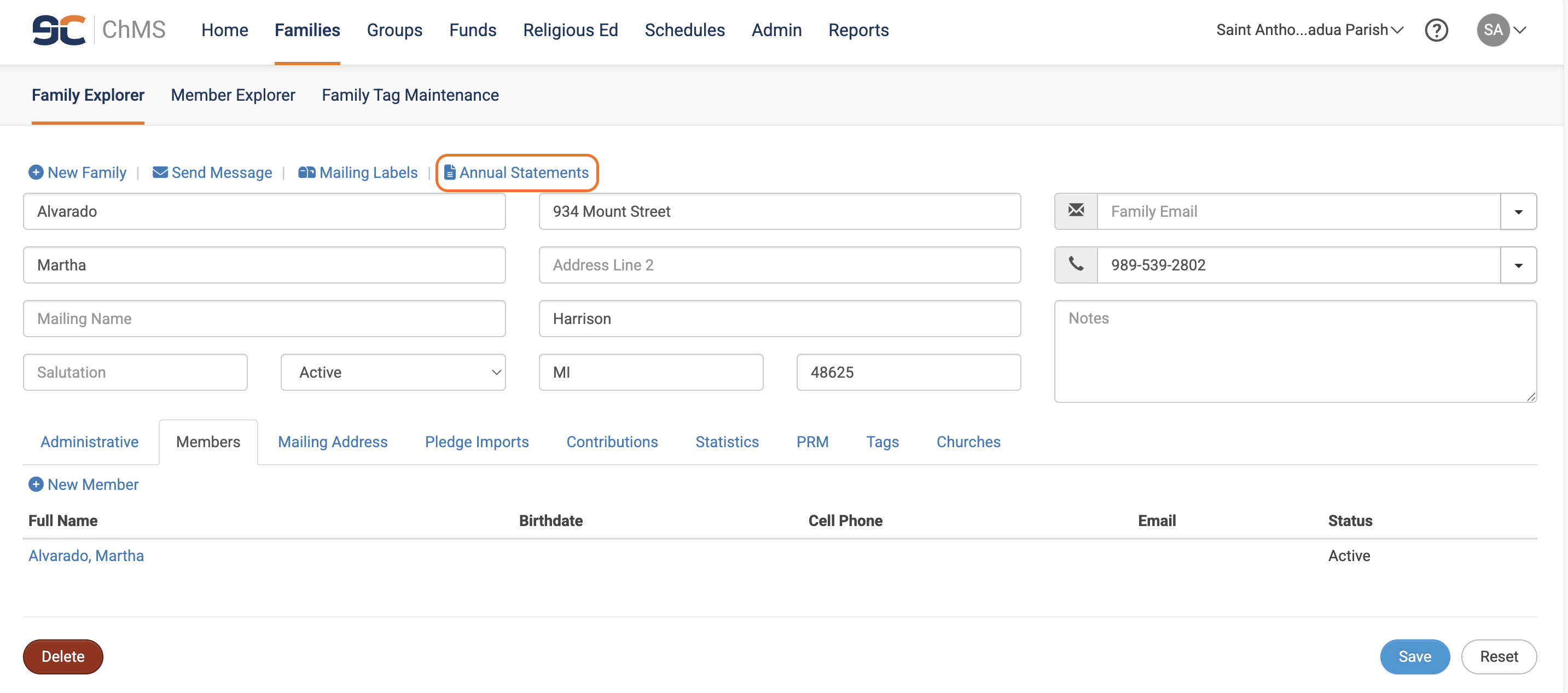 - If a parishioner calls you for an annual statement, go to Family Explorer. Use columns to search through and filter your data as needed to locate the correct family record.