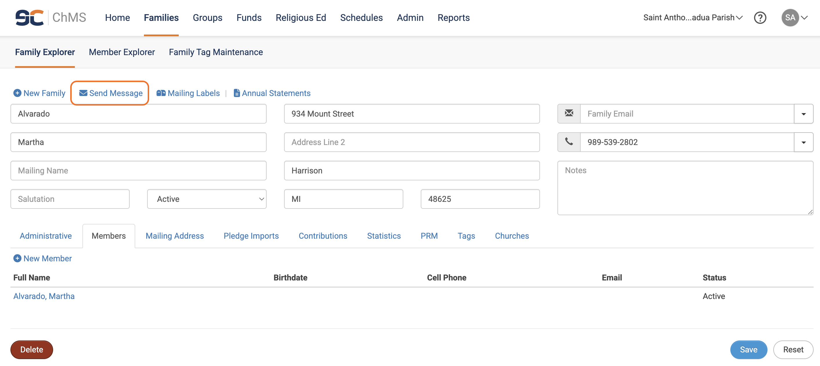 - You can chose to send this within the database as an email or navigate to your email and attach the file. If you would like to send it via the ChMS, select "Send Message" button within the family record.