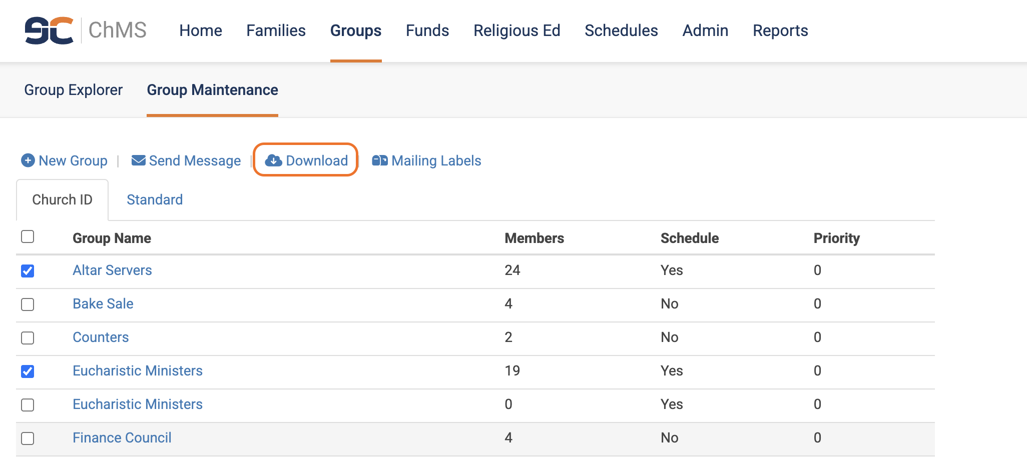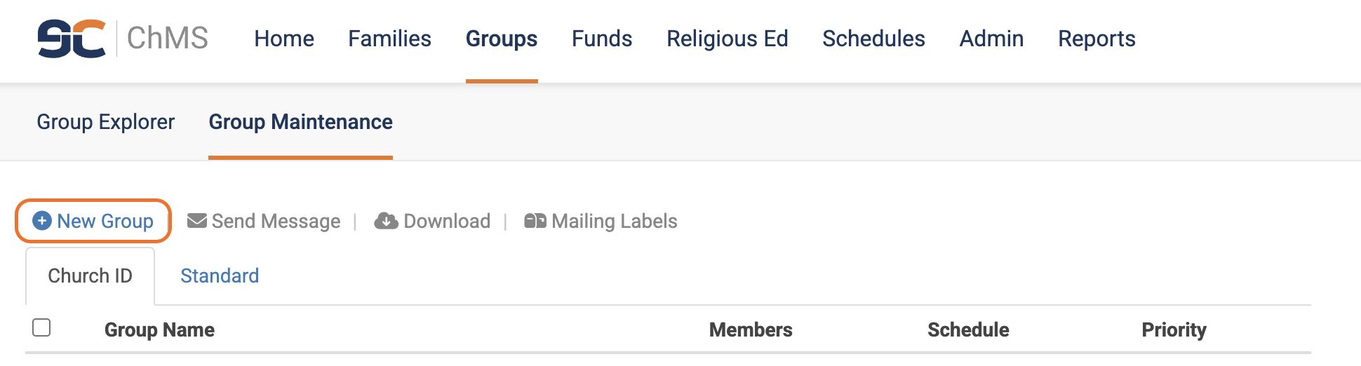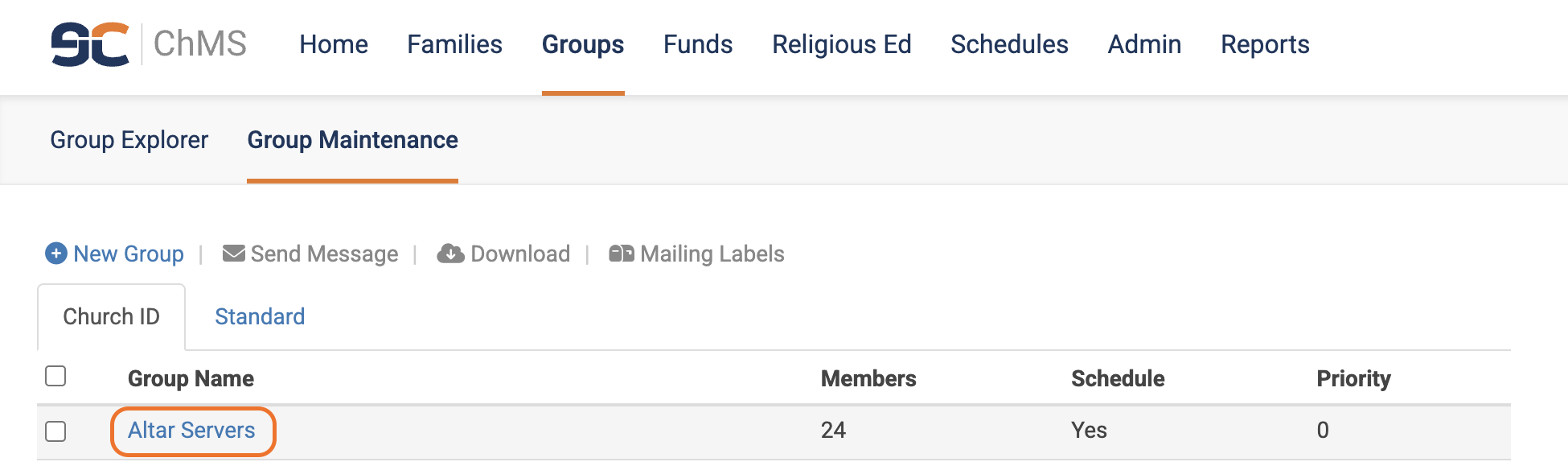 Groups are a way of grouping members together for communication and organization. They give the Pastor and parish staff a quick way to reach out to parishioners. Some examples of groups include Bible Study Groups, Eucharistic Ministers, Finance Council, and Lectors. To get to Group Maintenance, you'll want to go to Groups > Group Maintenance through the blue navigation bar at the top of your screen.
