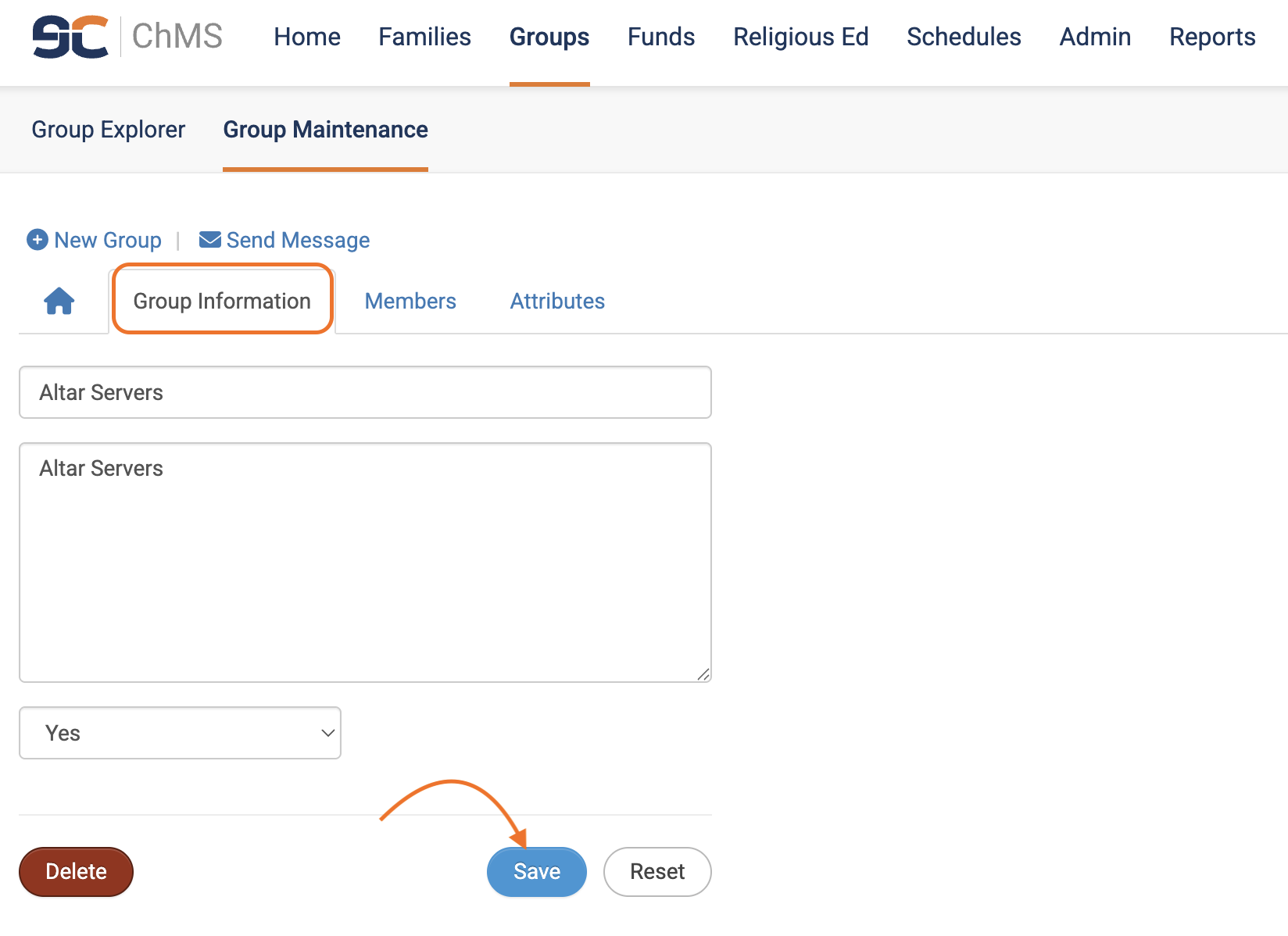 - The Yes / No drop-down is used to signify whether or not this Group will be used in Ministry Scheduling.