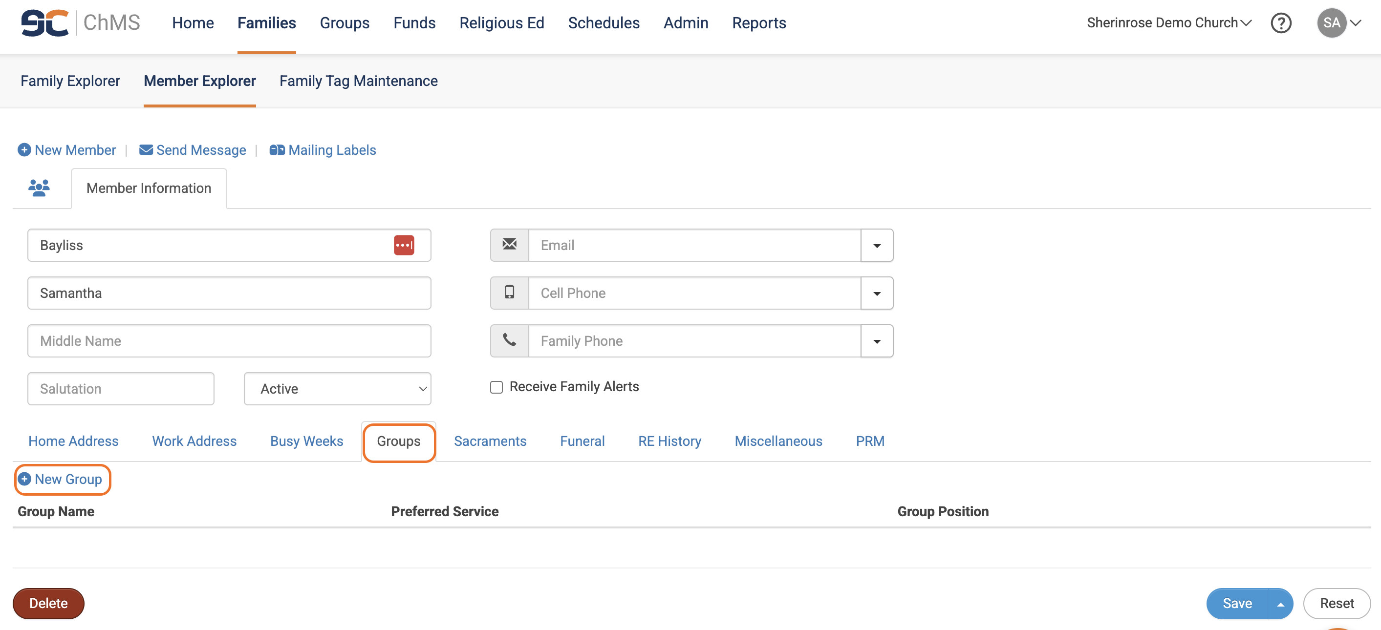 - Click on Families via the top navigation bar and select Member Explorer. Search for the member you wish to add or delete to/from a group, and open up their record.