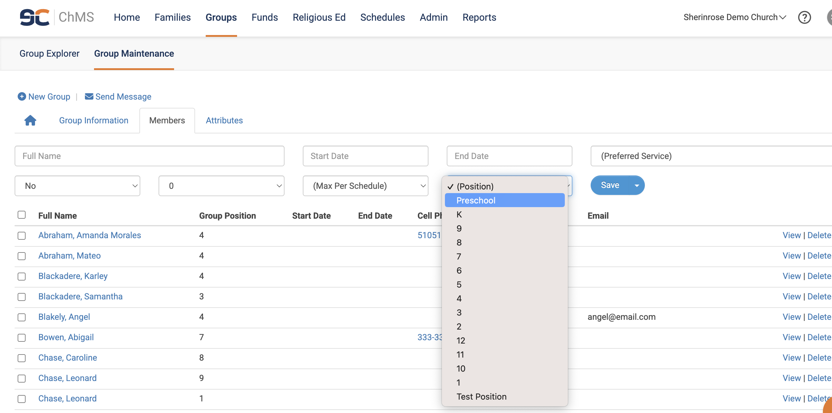 A parish/diocese can setup a Group Attribute type Position. If these positions are added as an attribute, then the list of positions will show in the drop-down menu as shown in the screenshot below. This will allow for consistent entries of positions across all groups. For example, Vice President can be added as VP, V-President, or Vice President. To prevent multiple position names from occurring we suggest you add your positions under the Attributes Tab.