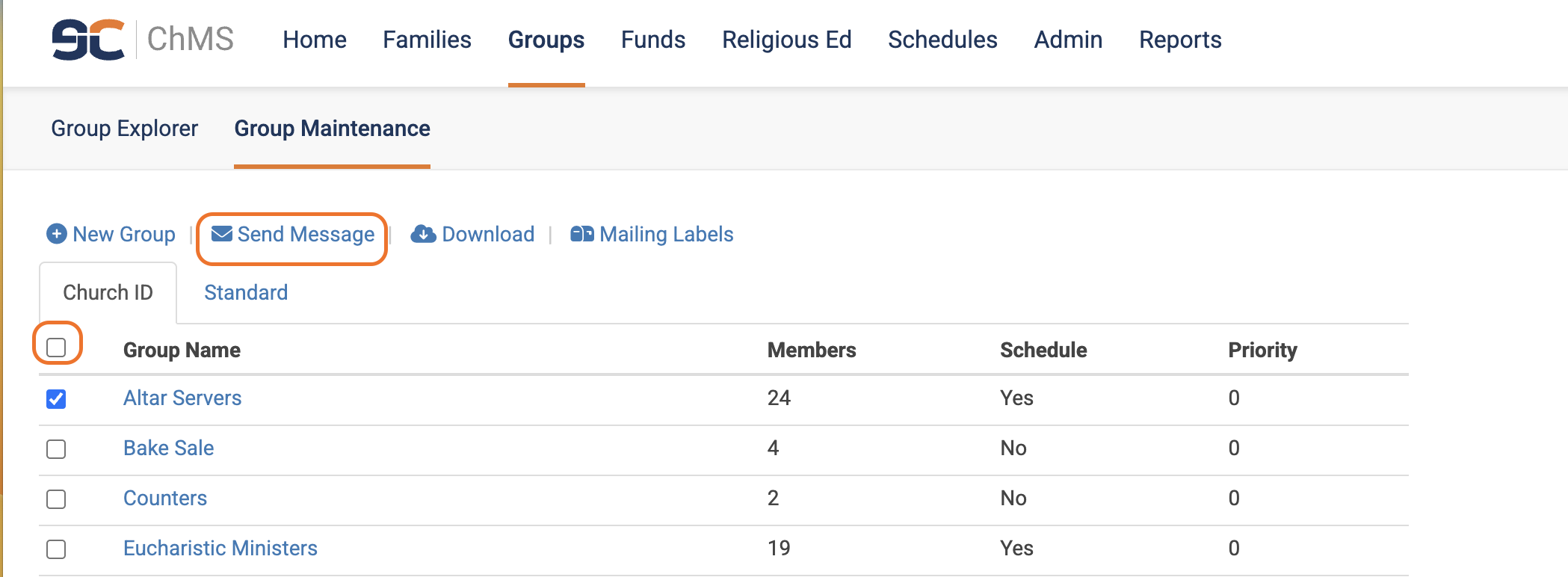 To send a message to one group or multiple groups, first check the box(es) next to the group name(s), then select Send Message.