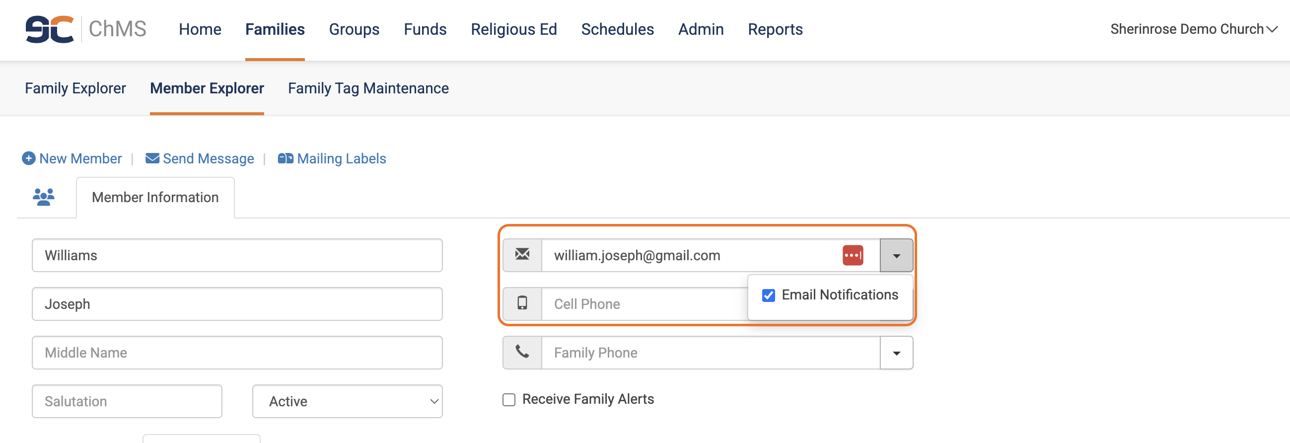 For a member to receive emails sent to families, the member must have the Receive Family Alerts box checked. However, this does not work in the reverse. If you are emailing a member who has the Receive Family Alerts box checked, that email will only be sent to the member email and will not also go to the family email.