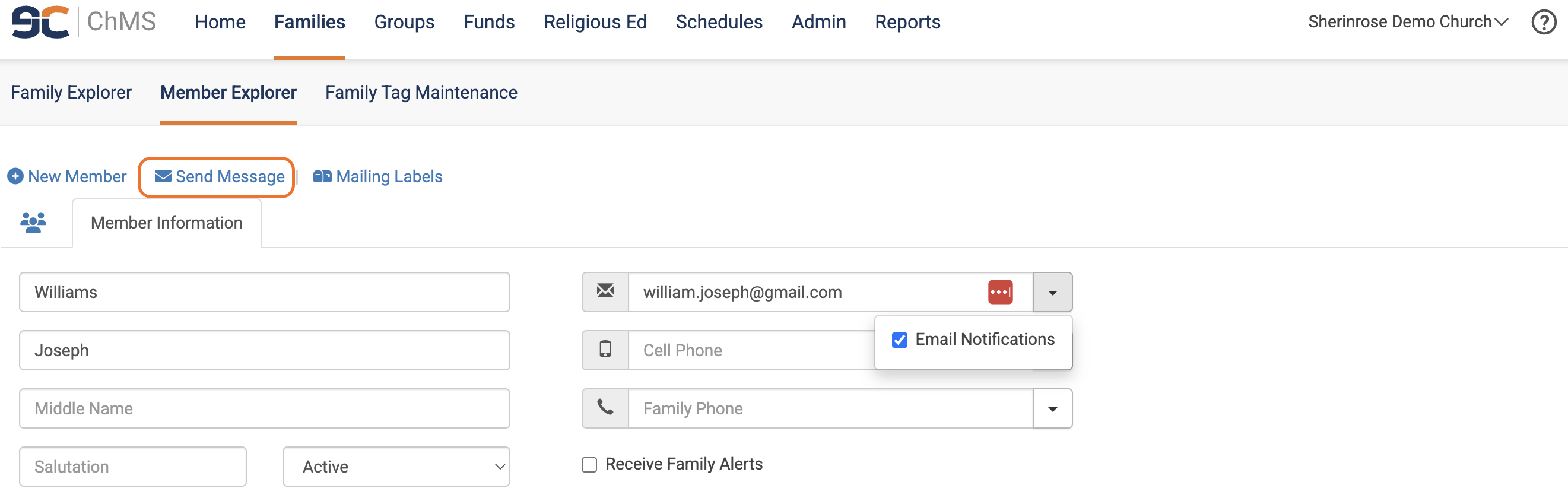 To email an individual member through their Member Record, simply click into the Member Record in question by clicking on their First Name or Last Name. Then click Send Message toward the upper left corner.