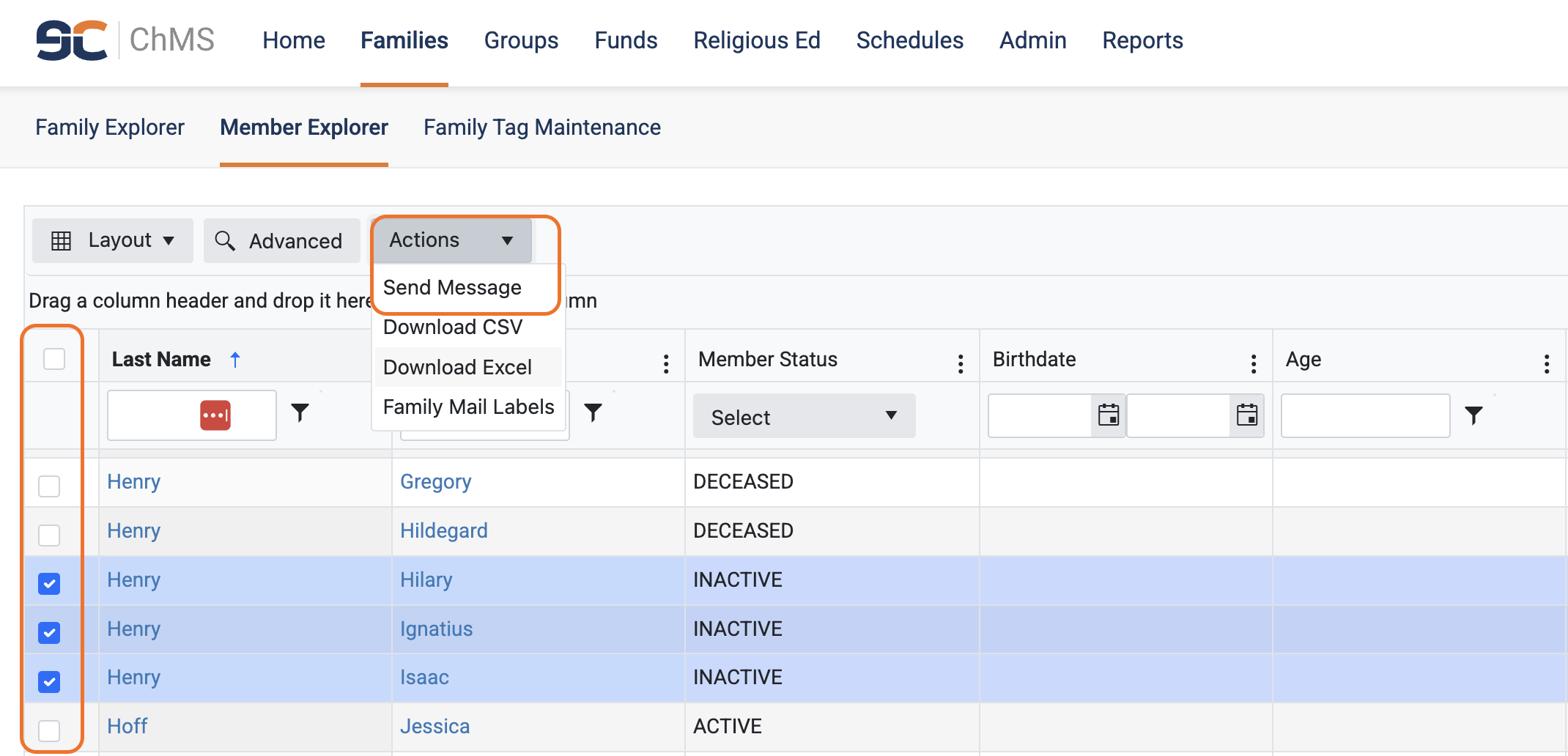 Within Families > Member Explorer, filter and sort your data to find the members you want to email. Select those members by checking the box(es) next to their Last Name(s). If you wish to send an email to all members in your parish, check the box next to the Last Name heading. Then click Actions and select Send Message from the resulting drop-down menu.