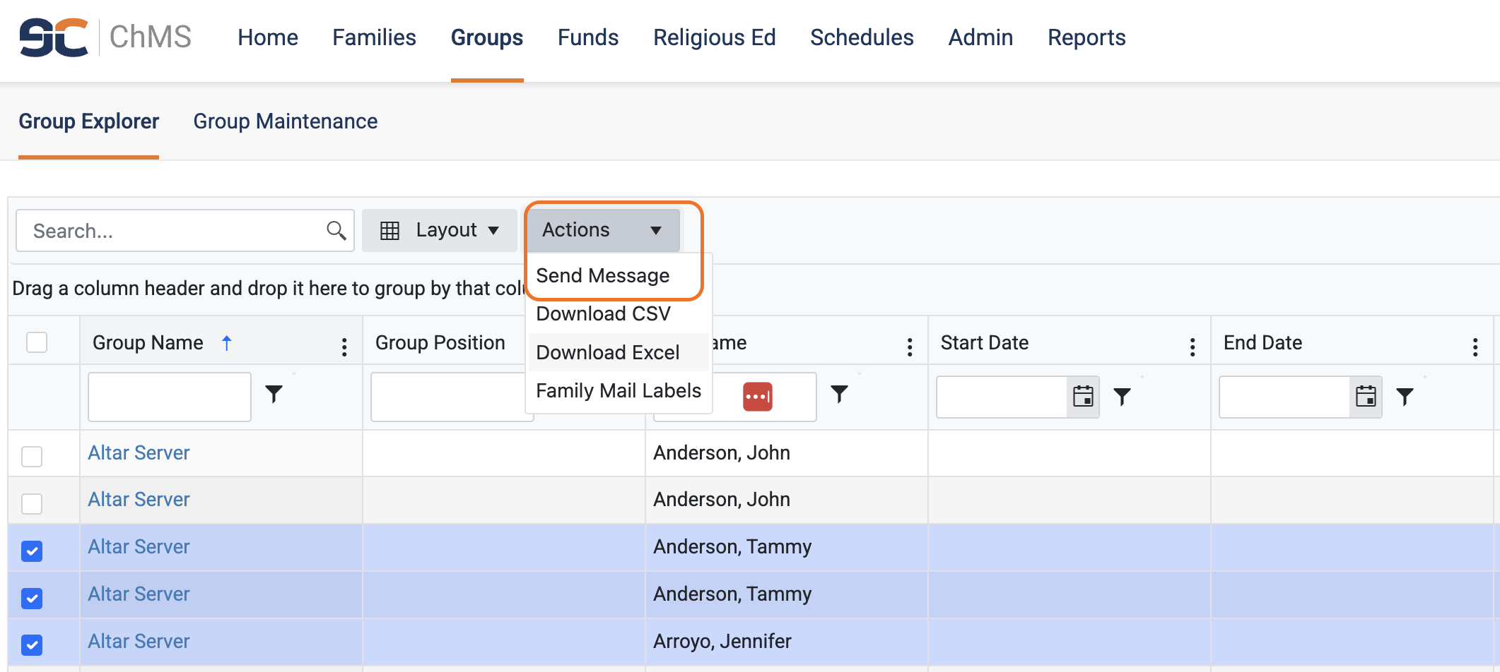 Emailing through Group Explorer is a great option to consider when emailing individual members across multiple Groups. Within Groups > Group Explorer, filter and sort your data to find the members you want to email. Select those members by checking the box(es) next to their Group Name(s). If you wish to send an email to all members in your groups, check the box next to the Group Name heading. Then click Actions and select Send Message from the resulting drop-down menu.