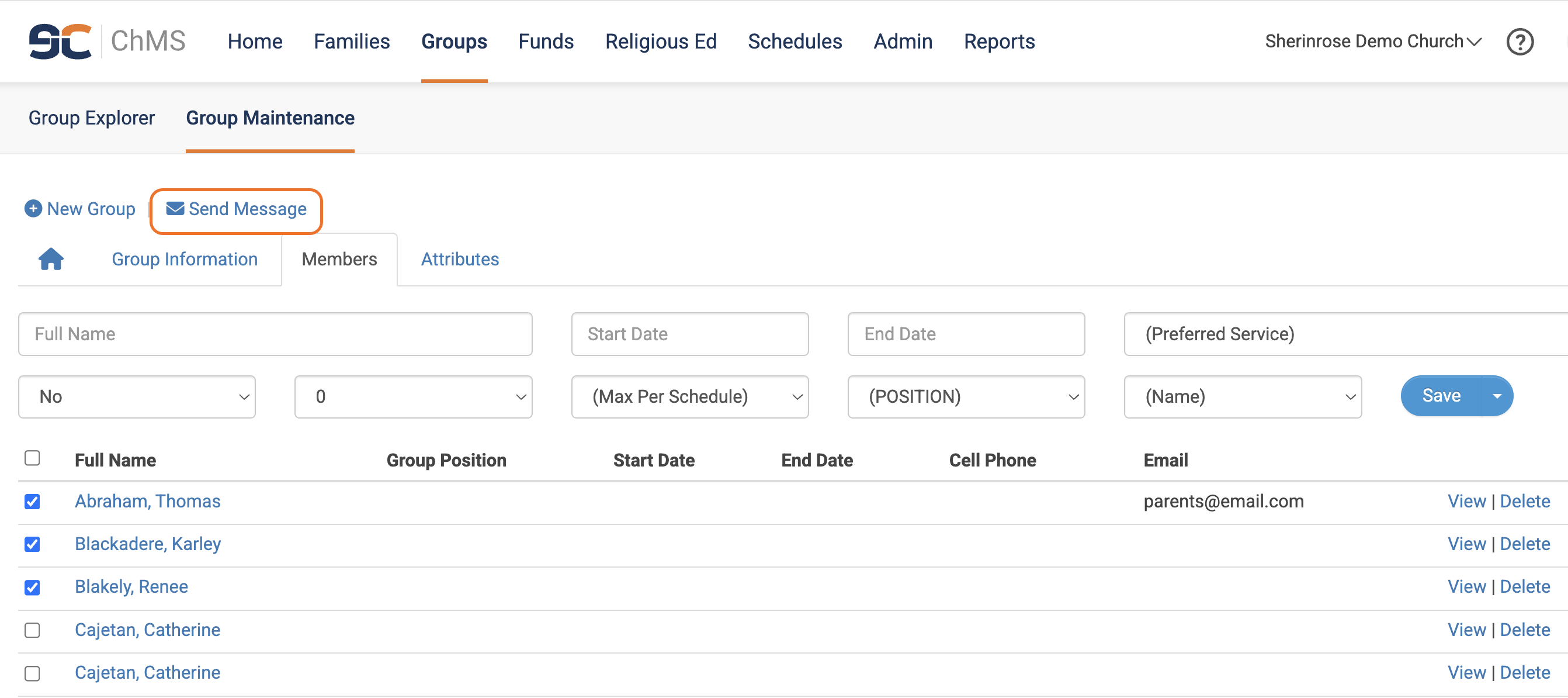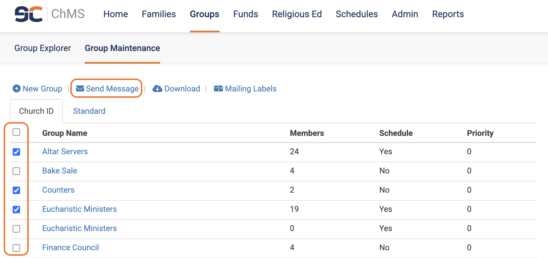 Emailing through Group Maintenance allows you to email all members of one or multiple Groups. Go to Groups > Group Maintenance. Select the Group(s) you want to email by checking the box(es) next to the name(s) of the Group Name(s). If you wish to select all the Groups, check the box next to the Group Name heading. Then click Send Message toward the upper left corner.