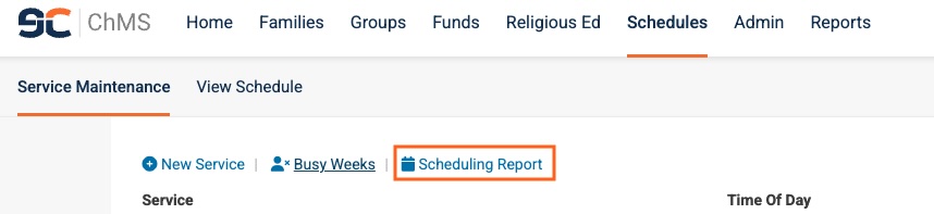 Go to Schedules, then on the Service Maintenance page click Scheduling Report from the top of the table.