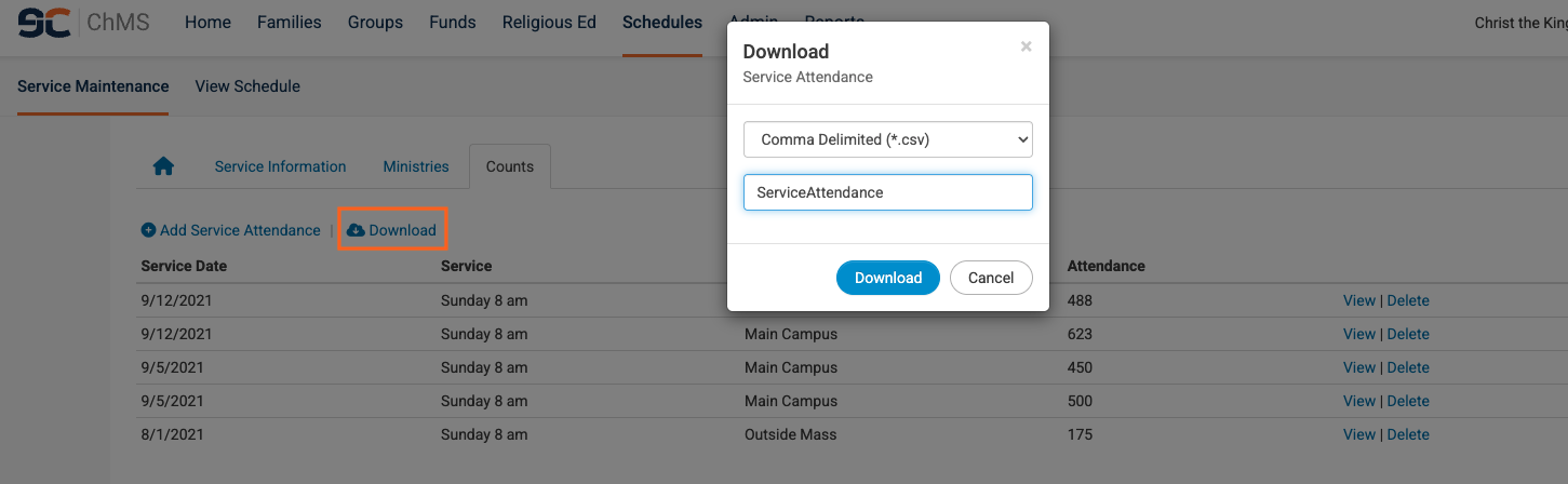 Go to Schedules > Service Maintenance, then click View next to the service you want to download the Mass Attendance for. Select the Counts tab then choose Download and you will be prompted to download the file as an Excel .xlsx or .csv. This data can be used to create graphs to view trends in Mass Attendance and files can easily be sent to your Diocese.