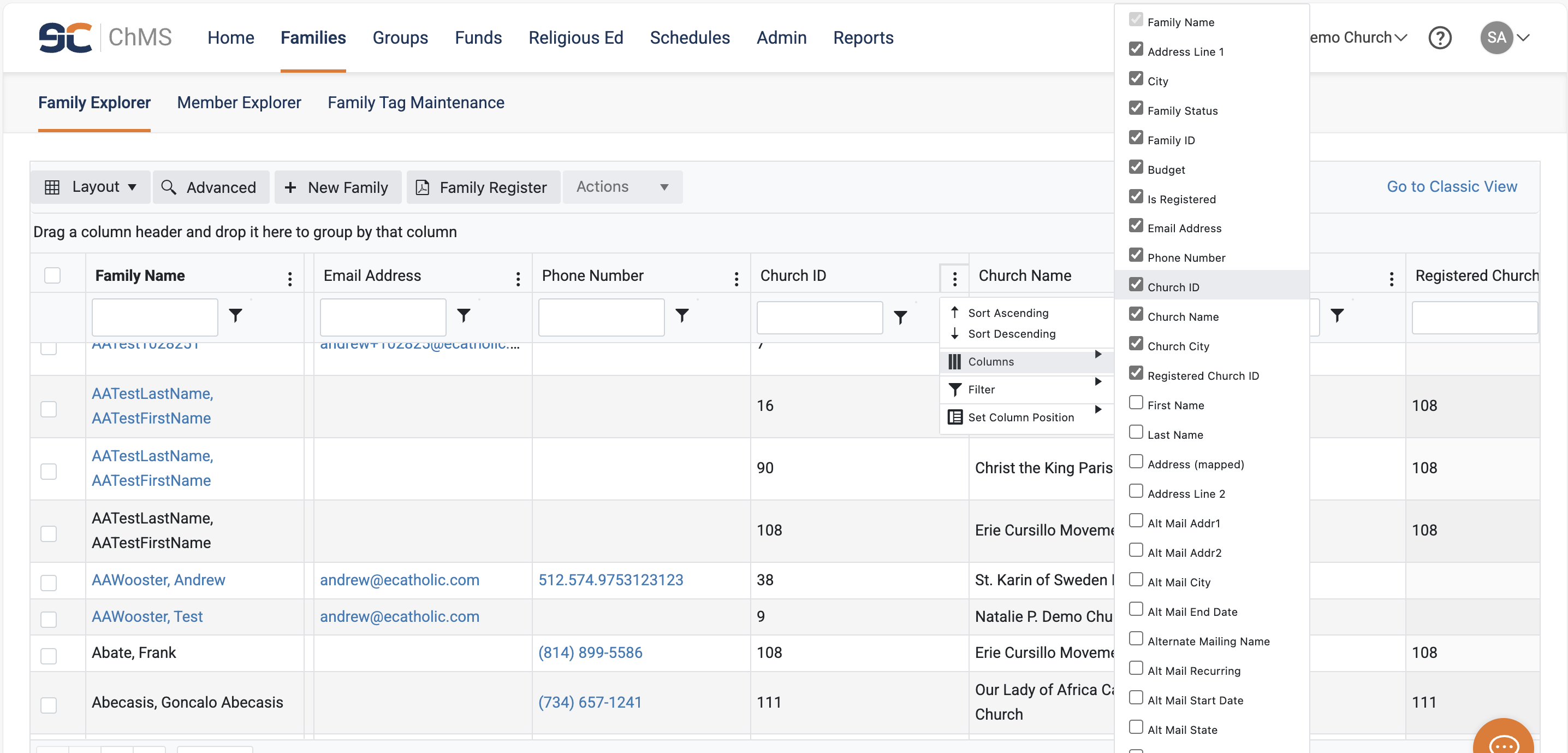 - When you initially open Member Explorer, the Church ID column will be populated with the church ID number that you initially logged into.