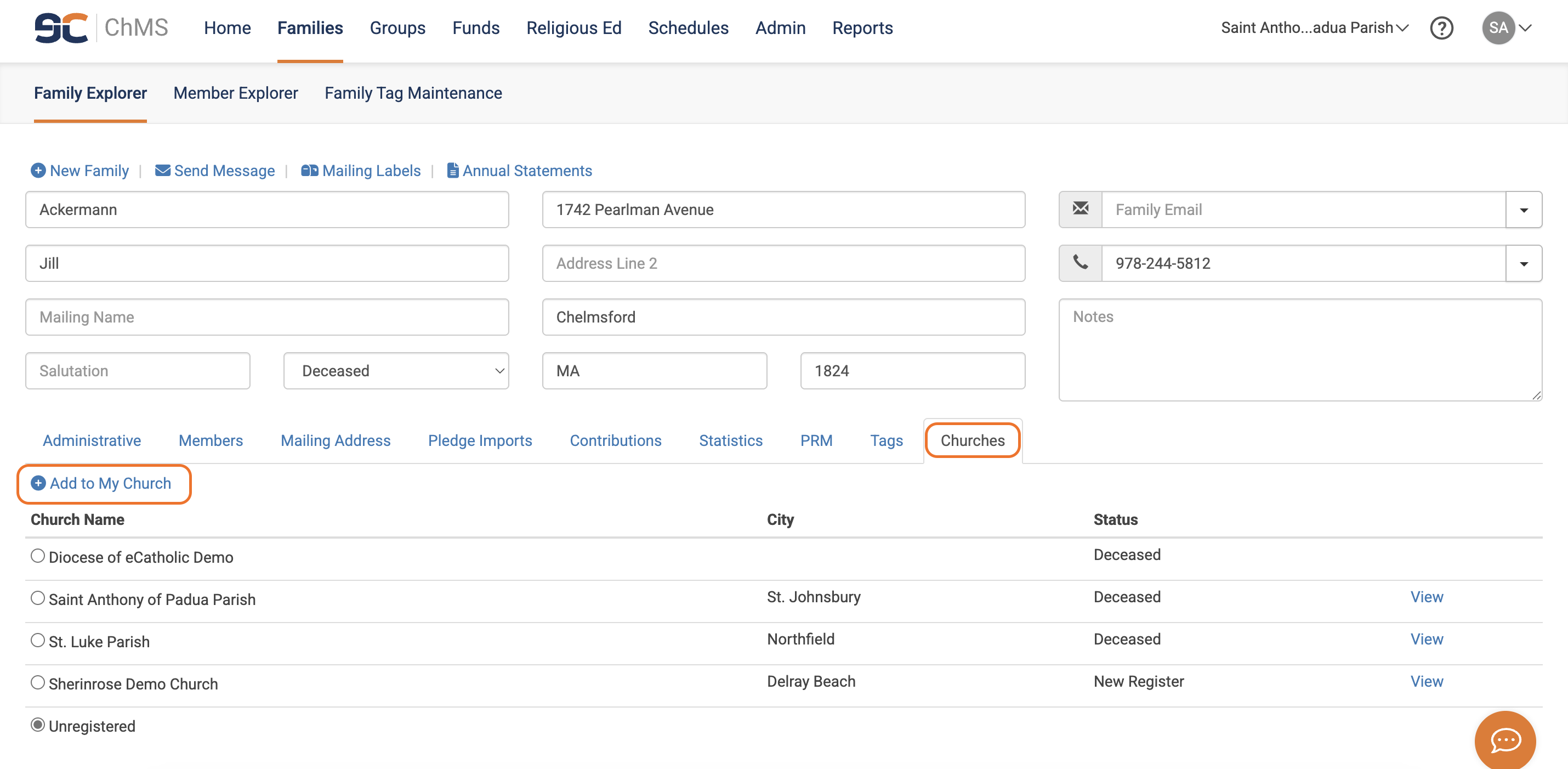 - Once you have clicked on the Family record you would like added to your church, go to Churches > Add to my church. See image below: