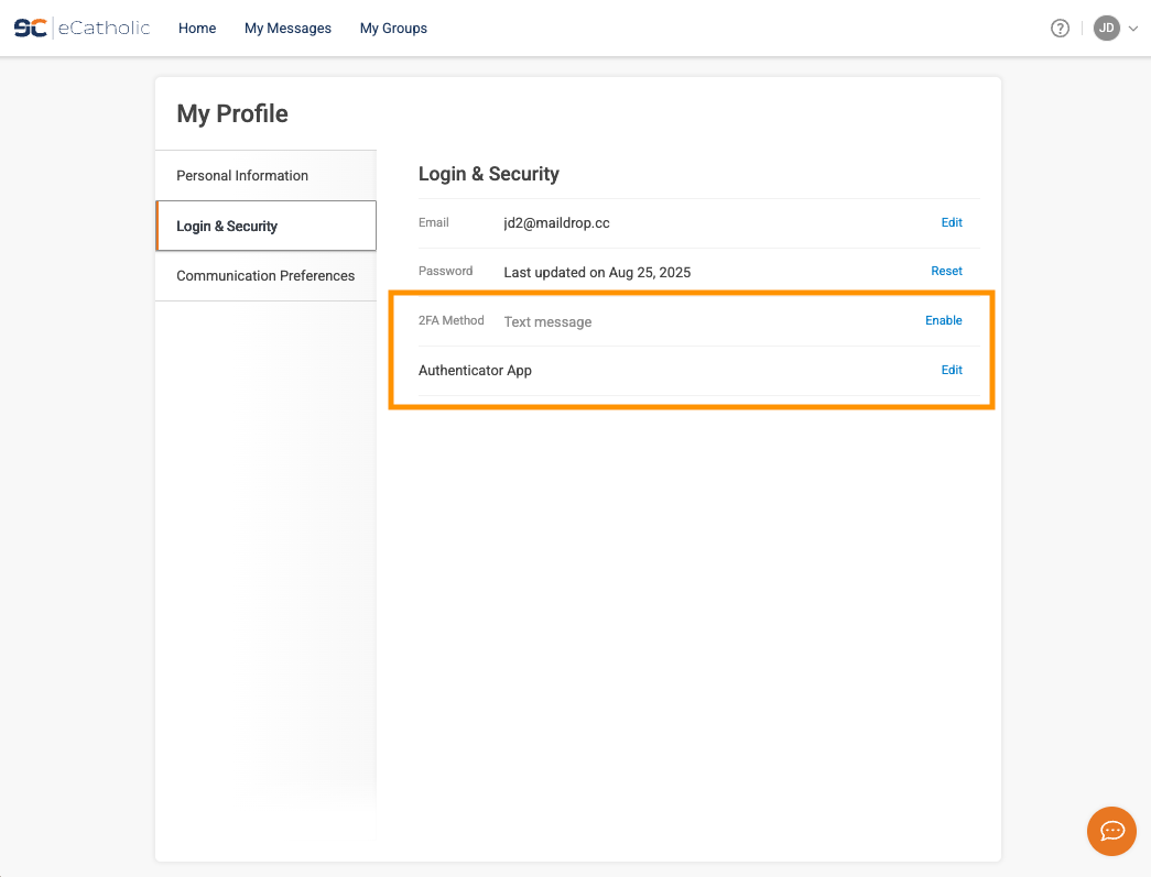 - Click the Edit /Set Up button for 2FA - On the My Profile screen, go to the Login & Security section and locate the 2FA Method field, then click Edit / Set Up.