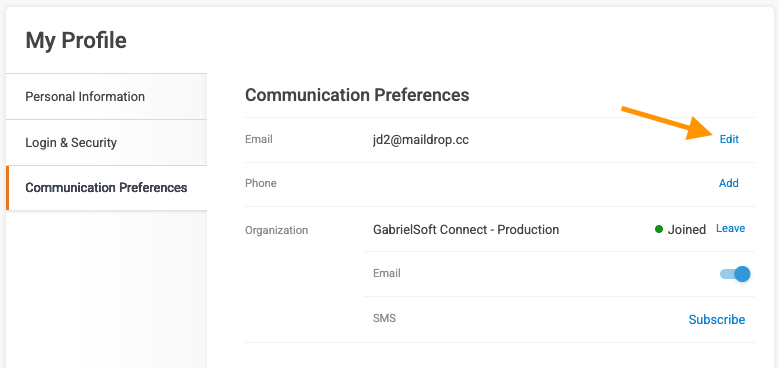 - Click the Edit button for your contact email - On the My Profile screen, go to the Communication Preferences section and locate your current contact email, then click Edit.