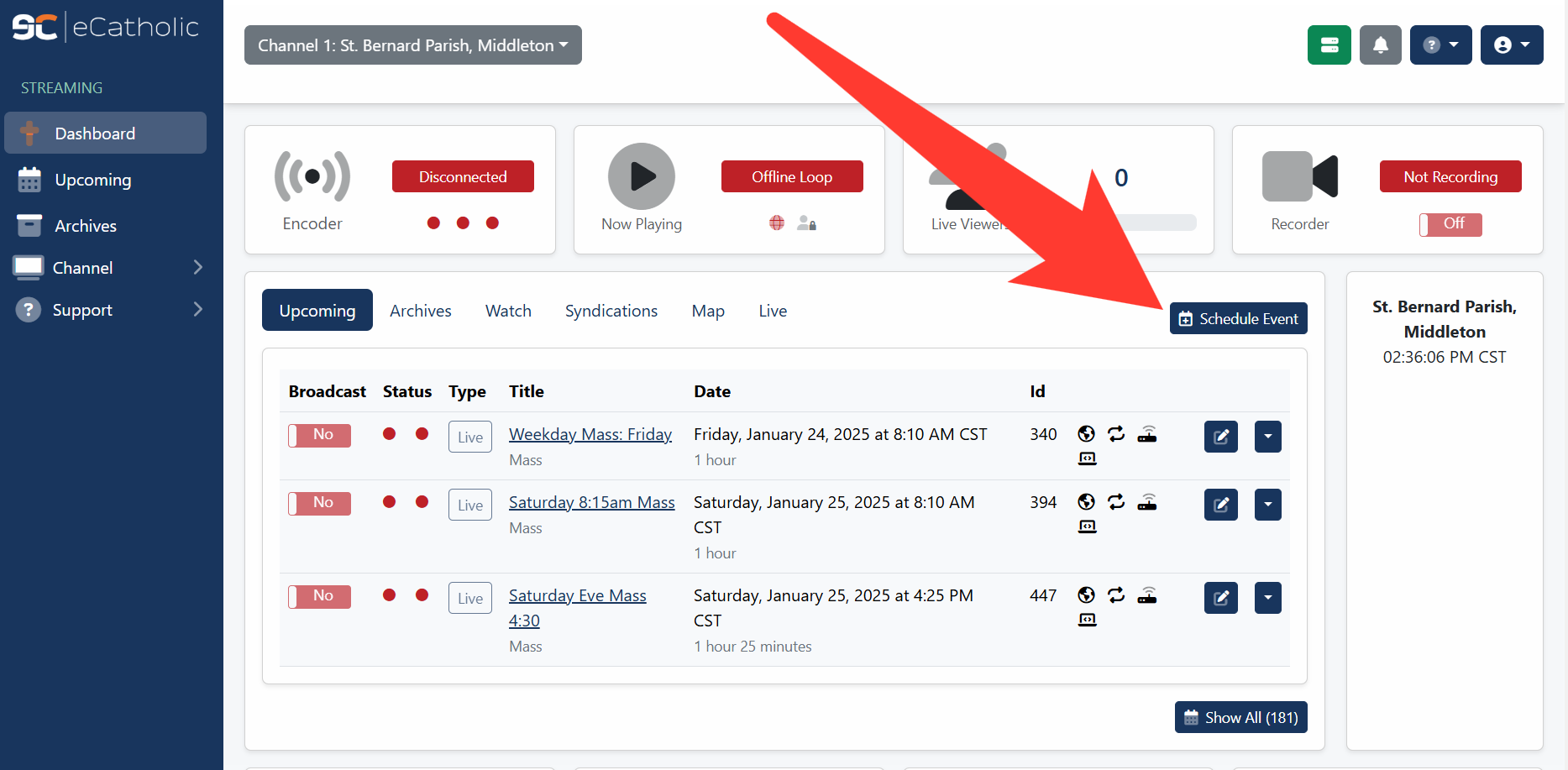 - To view and edit this Simulated Live video broadcast that was just created, return to the dashboard and look under "Upcoming".