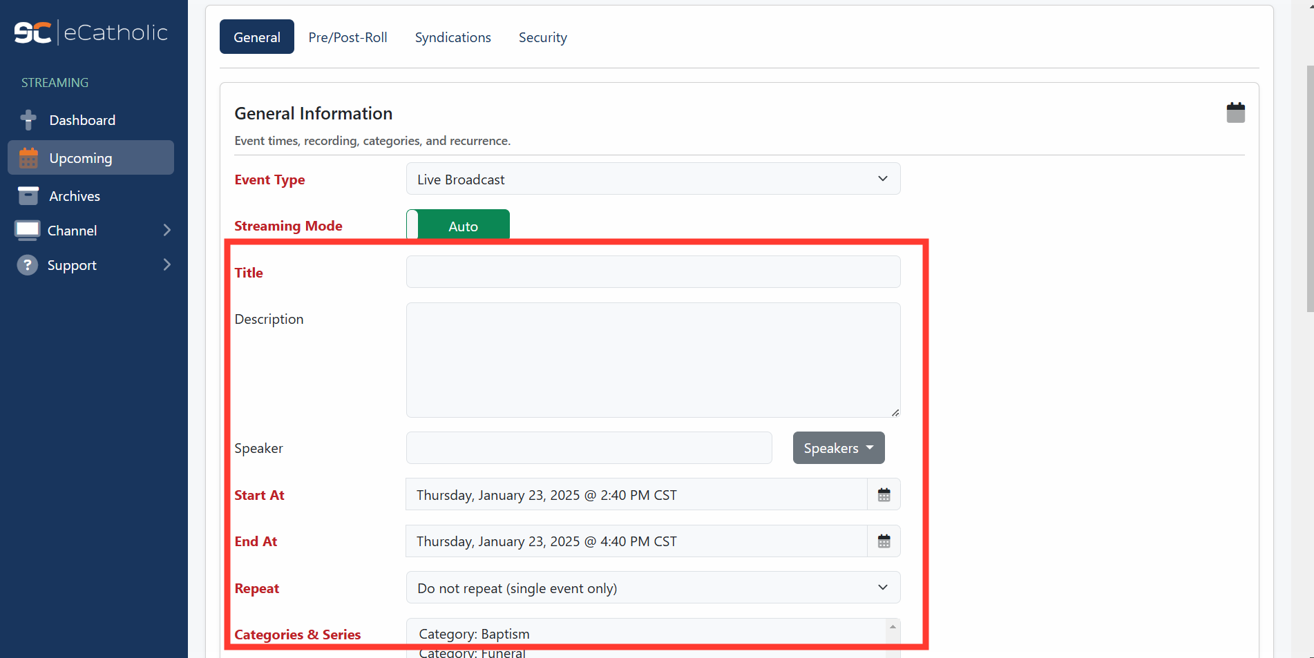 - Fill out the necessary information such as Title, Description, Start Time, and End time, Category etc