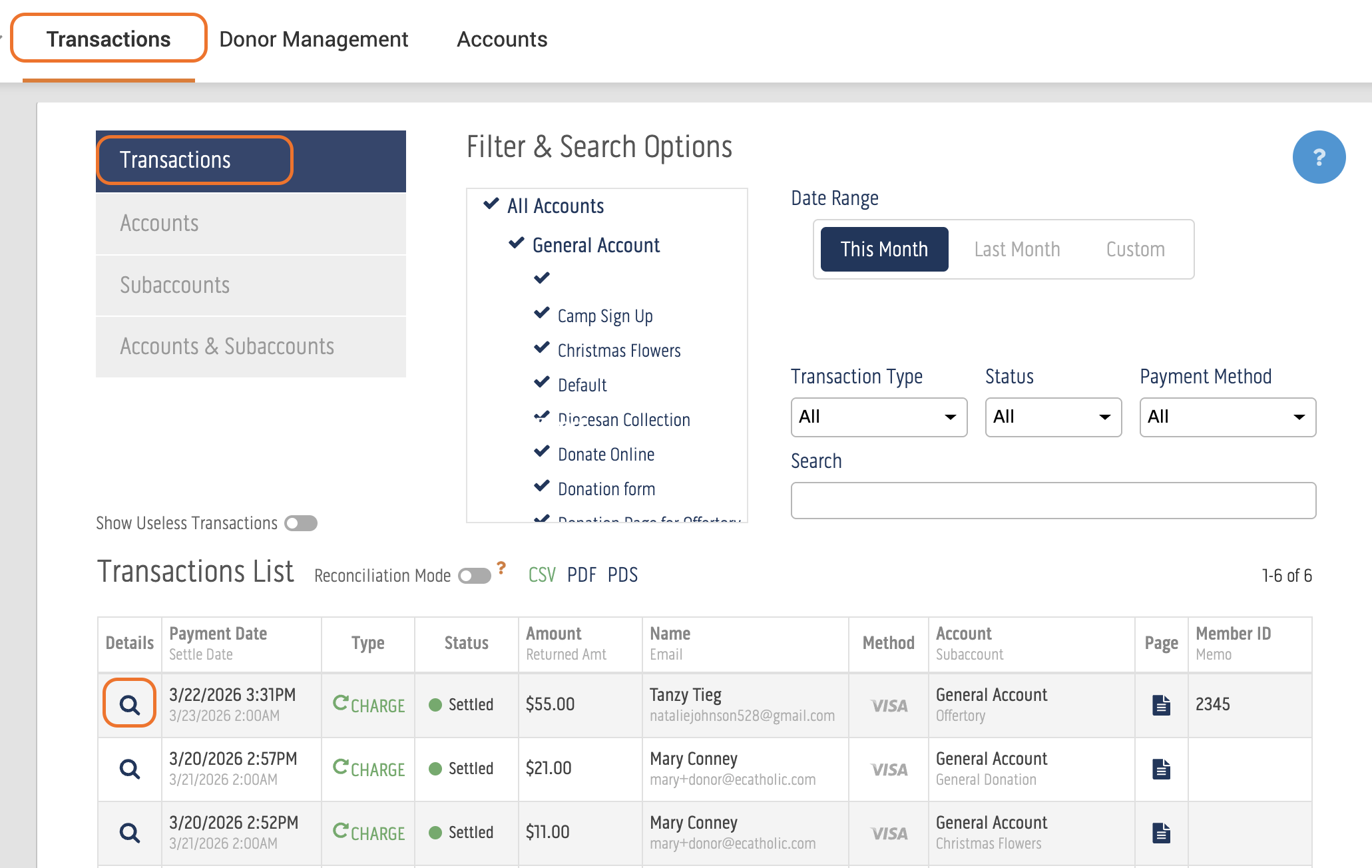 The eCatholic Payments Center makes it easy to locate a specific transaction and view the transaction's details. Here are the steps: