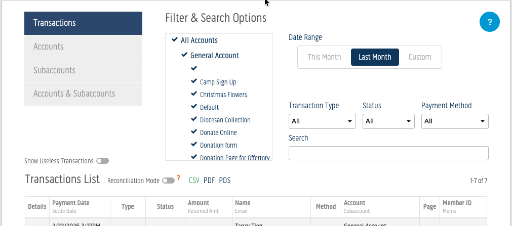 Once in the Payments Center, the Transactions / Reporting tab will display your Transactions List for all accounts and subaccounts within the current month by default.