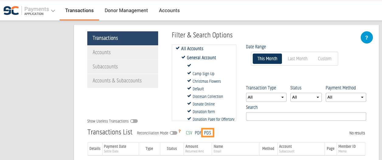 Then click on the "PDS" link above the list of transactions to download a CSV file of your transactions formatted specifically to be imported into PDS. See Downloading Reports for full instructions.