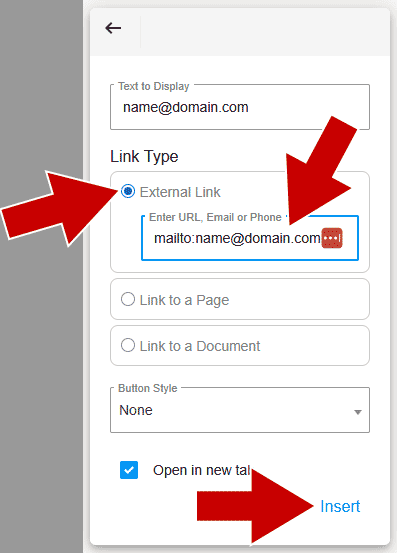 In the URL field type in mailto:[email protected] and then click Insert.