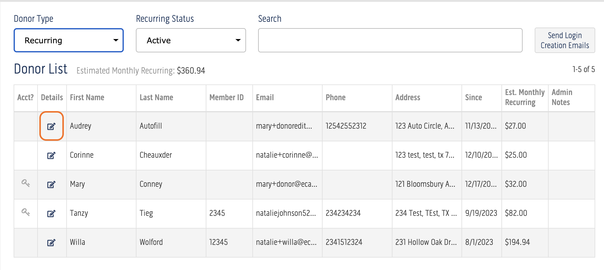 Within the Donor Management tab, locate the donor to whom you would like to send the account creation email. Then, click the details icon in the Details column for that donor (illustrated below). This will open the Donor Details dialog.